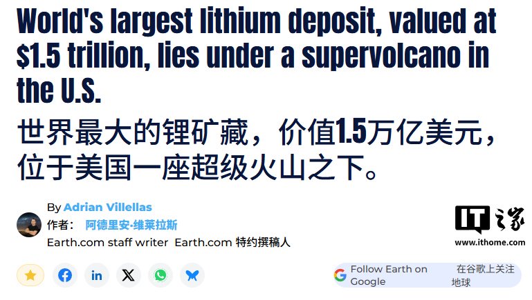 Earth.com 估算,该区域蕴藏着 2000 万至 4000 万吨富锂粘土(Lithium-rich clay),按当前市场价格计算,这座矿床的潜在价值高达 1.5 万亿美元(IT之家注:现汇率约合 10.62 万亿元人民币)。