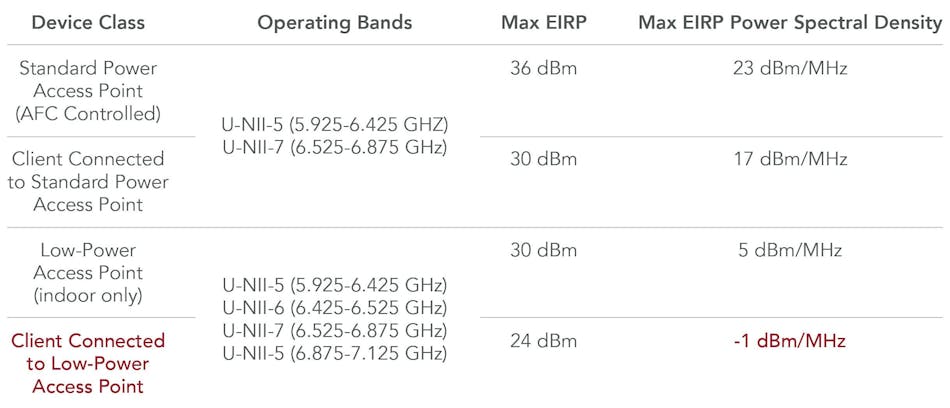 其中,低功耗室内(LPI)客户端设备面临最严格的-1 dBm/MHz功率谱密度(PSD)限制。这一严格的PSD要求通常限制了上行链路(UL)发射距离——这造成了固有的UL/DL功率不平衡,使得接入点容易被客户端听到,但客户端难以可靠地联系到远距离的接入点。