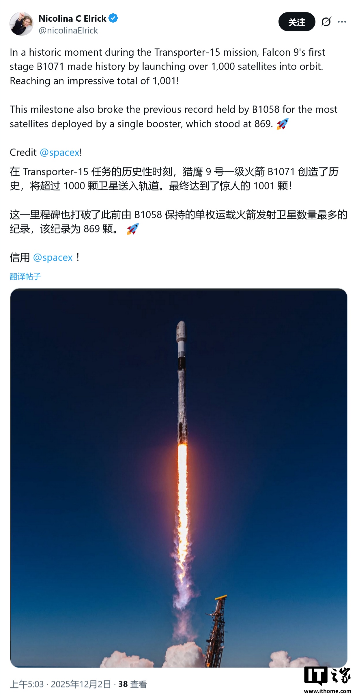 IT之家 12 月 2 日消息,科技媒体 teslarati 昨日(12 月 1 日)发布博文,报道称 SpaceX 再次刷新航天复用纪录,其代号为 Transporter-15 的任务不仅成功将 140 颗航天器送入轨道,更核心的成就是一级助推器 B1071 完成了第 30 次飞行与回收,并将 1001 颗卫星送入轨道。