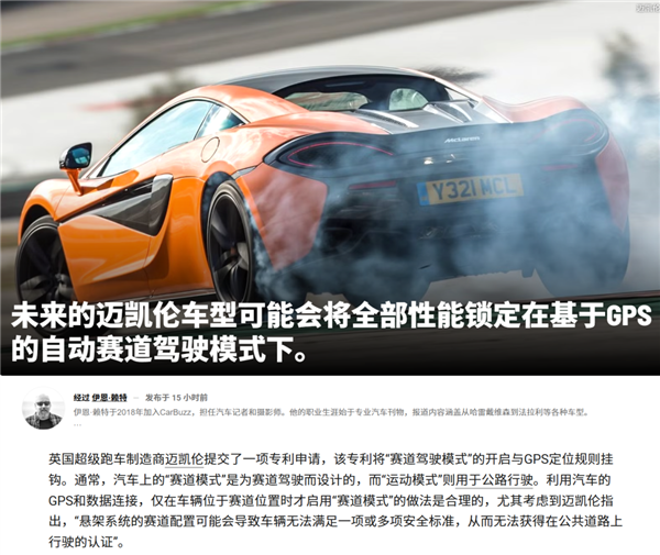 比如迈凯伦就申请了一个专利,说是可以通过 GPS 锁定,让 “ 赛道驾驶模式 ” 只能当你定位在赛道的时候才可以开启,终于准备把这玩意儿当作一个强制方案。