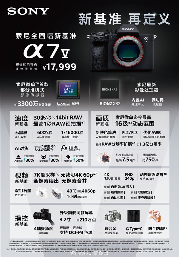快科技12月2日消息,索尼中国正式发布全画幅微单新基准Alpha 7 V,其型号为ILCE-7M5,即日开启预售,建议零售价为17999元。