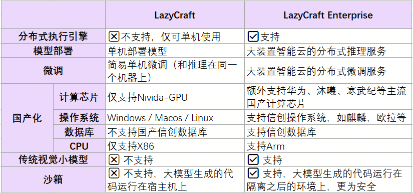 在开源版的基础上,我们额外提供了LazyCraftEnterprise。LazyCraftEnterprise具备LazyCraft的全部能力 ,并额外支持如下功能:
