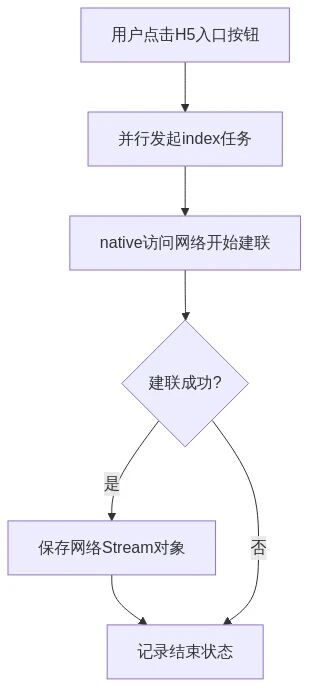 用户点击H5入口按钮,并行index任务发起,访问网络开始建联,一但完成有效建联,则保存网络stream对象,当webview需要使用该数据流的时候,判定stream对象是否存在,如果存在,则直接使用该数据流,如果stream对象不存在,则判定网络访问是否返回,如果是因为网络访问失败导致stream为空,则认为是并行任务失败,否则会进入等待模式,等待模式下,线程建立一个循环体,每隔5ms,探测一次stream是否存在,网络是否已完成建联,一但探测到结果,则退出循环体,即使多次没有探测到结果,1500ms后依然退出循环体,此时放弃并行任务数据,改为webview自主加载资源。