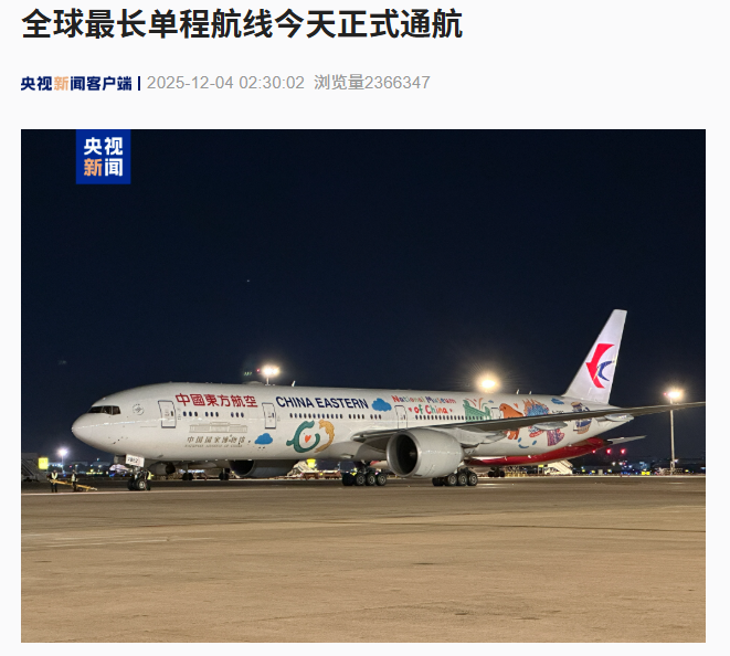 IT之家 12 月 4 日消息,据央视新闻报道,今天(12 月 4 日)凌晨,中国东航 MU745 航班从上海浦东国际机场起飞,经奥克兰最终将到达阿根廷布宜诺斯艾利斯。