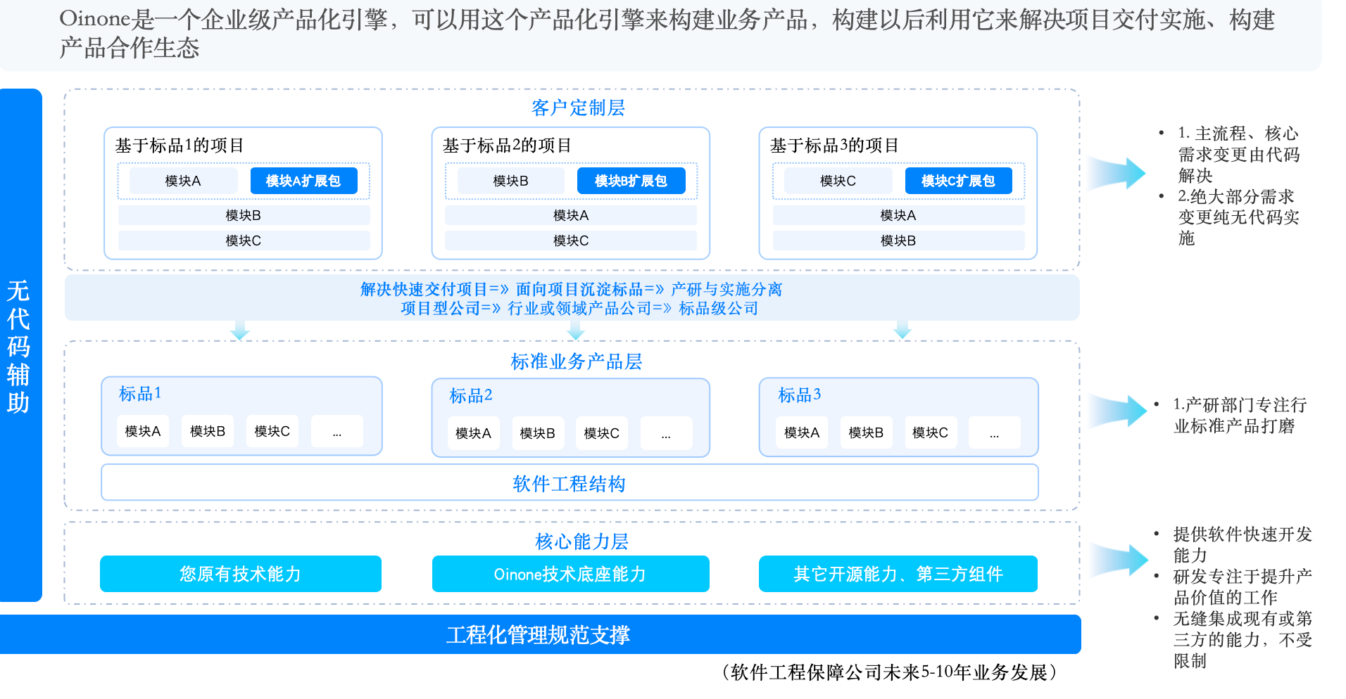 上述场景 Oinone 在产品矩阵中均有对应的设计器与能力项(模型/流程/界面/数据可视化/集成/商城等)。