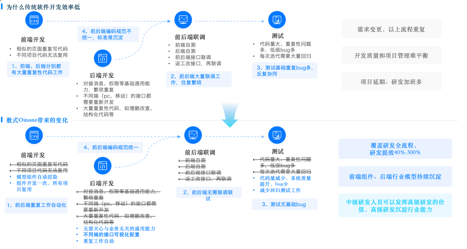 怎么评估: 是否同一平台一体化承载?有无”低/无”割裂导致的二次集成成本? Oinone 怎么做: 低/无一体 :低代码沉淀标准产品,无代码叠加个性化需求,快速响应变化。