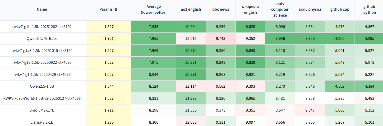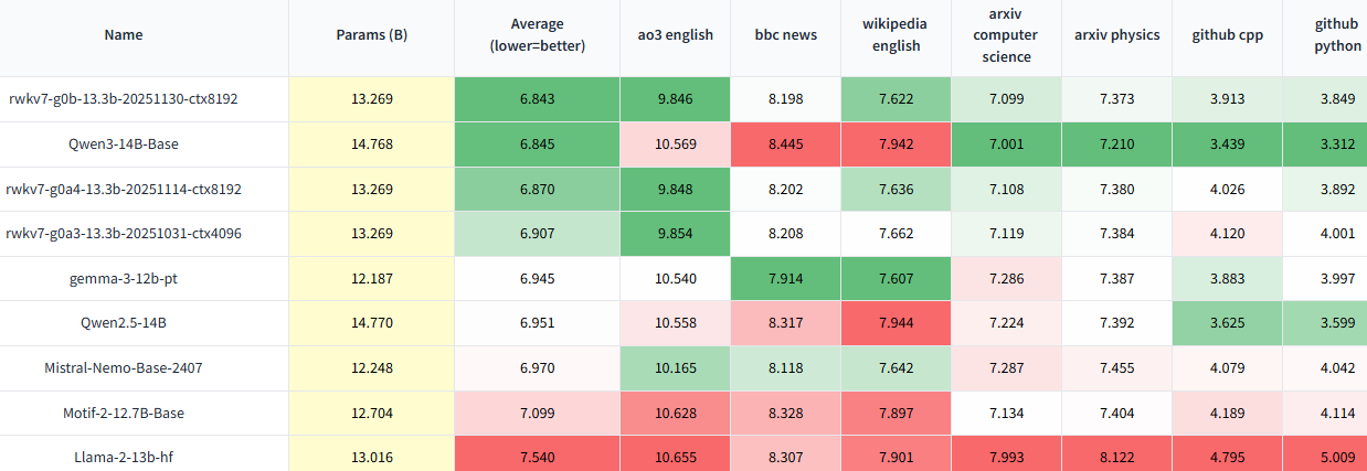 RWKV7-G0b 13.3B 在 Uncheatable Eval 评测中超越 Qwen3-14B-Base 模型。