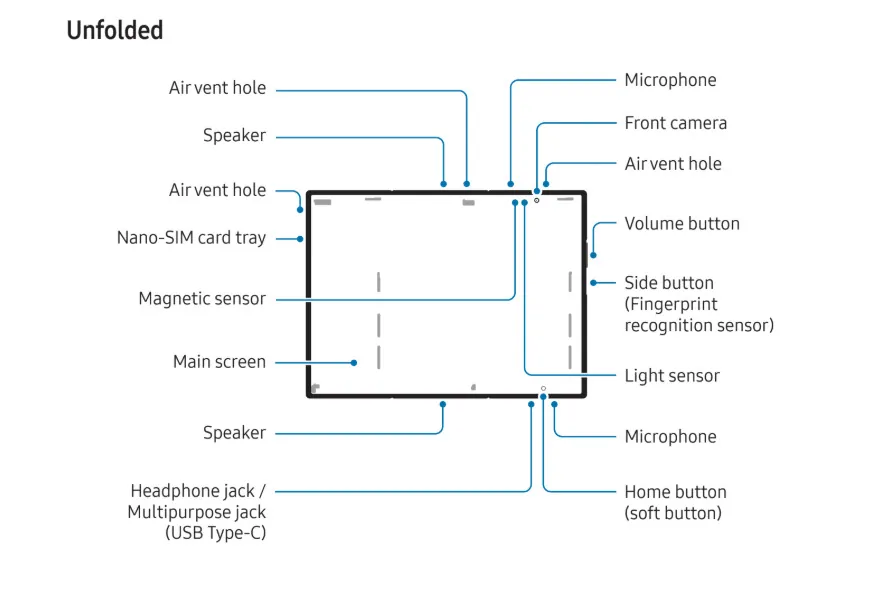 手册中的示意图澄清了一个关键硬件细节。在展开状态的图示中,虽然出现了“耳机插孔”的文字标注,但这并非传统的 3.5mm 接口,而是通用的 USB-C 接口,考虑到机身极致轻薄的形态,取消实体耳机孔在预料之中。IT之家附上相关图片如下: