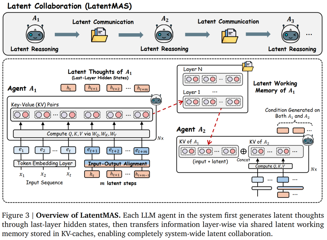 在智能体之间,信息通过存储在各层 KV 缓存中的共享潜在工作记忆进行交换,其中包含输入上下文以及新生成的潜在思维内容。