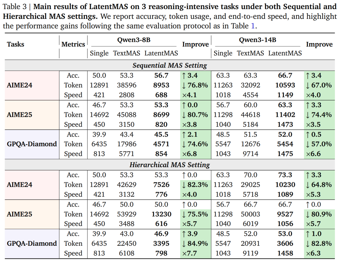 表 1、表 2 和表 3 展示了 LatentMAS 整体表现。他们从三个互补维度进行评估:(i) 任务准确率、(ii) 系统吞吐量(总输出 token 数)、(iii) 端到端推理速度。