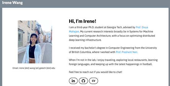Irene Wang是佐治亚理工学院的博士生,导师是Divya Mahajan。她的研究致力于解决大规模AI训练中的效率与可持续性问题。她开发了集成加速器架构、网络拓扑与运行时调度的协同设计框架(Co-design Frameworks),旨在优化分布式深度学习系统的性能和能效,推动绿色AI计算的发展。
