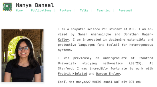 Manya Bansal是MIT的博士生,由Saman Amarasinghe和Jonathan Ragan-Kelley指导。她的研究致力于为现代硬件加速器设计新型编程语言和编译器。她开发的系统允许开发者编写模块化、可复用的高性能代码,旨在解决异构计算系统中的编程复杂性,同时保留对底层硬件的精细控制能力,以实现峰值性能。