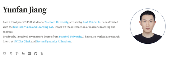 Yunfan Jiang是斯坦福大学计算机科学系的博士生,导师是李飞飞(Fei-Fei Li)教授。他的研究目标是构建通用的机器人系统,使其能够执行复杂的日常任务。他通过融合现实世界的全身操控数据、大规模仿真环境(如Minecraft)以及互联网级的多模态监督数据,开发可扩展的方法来训练具备高度适应性的机器人智能体。