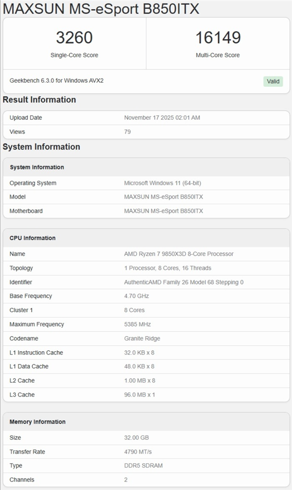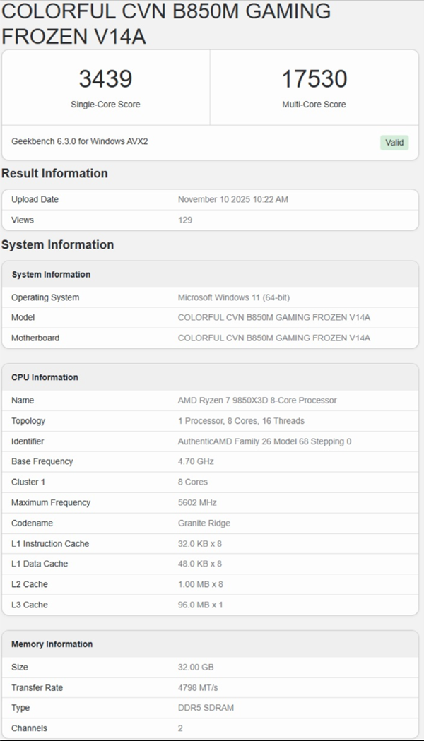 网友@Olrak29_曝光了GeekBench数据库中的锐龙7 9850X3D跑分,搭配的主板有七彩虹和铭瑄的,但是两个测试中的频率不一样,前者是5.6GHz,后者识别的只有5.38GHz,比传闻的频率低了200MHz。