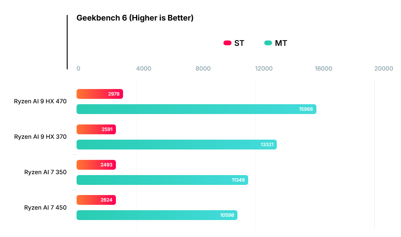 基准测试结果显示,得益于架构优化与频率提升,Ryzen AI 9 HX 470 的多核性能较前代 Ryzen AI 9 HX 370 提升了约 20%,单核性能提升约 15%。