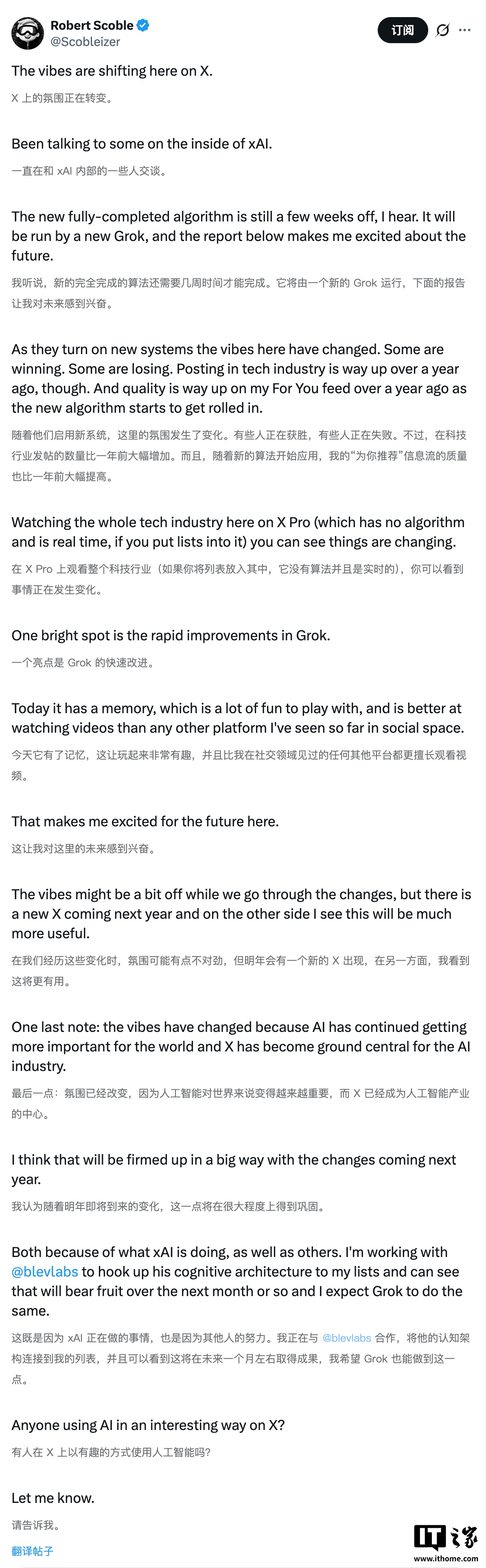 马斯克此次回复的帖子来自博主 Robert Scoble,IT之家附原文大意如下: