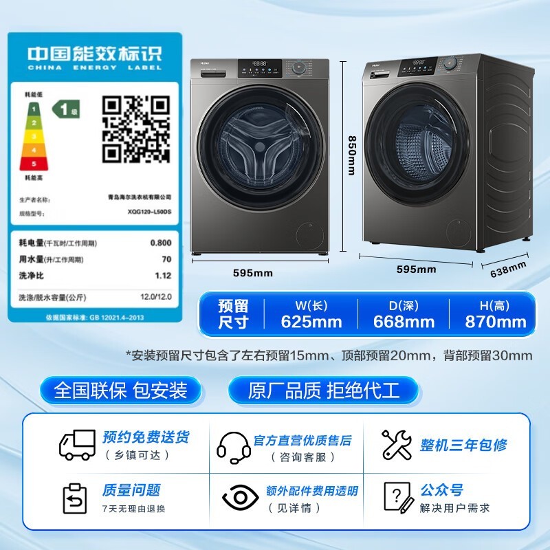 海尔12公斤滚筒洗衣机1367元起