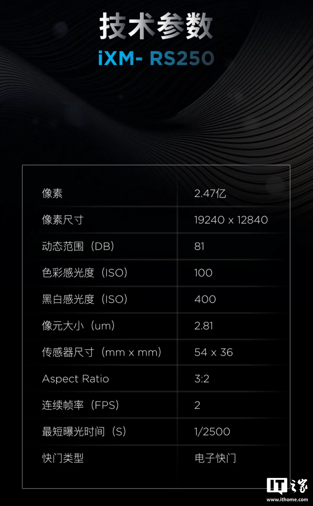 性能方面,这款相机的像素数是 2.47 亿,像素尺寸是 19240*12840,像素大小为 2.81μm,色彩感光度(IT之家注:ISO)和黑白感光度分别是 100、400,采用电子快门设计,最短曝光时间为 1/2500 秒,连续帧率 2FPS,动态范围可达 81dB。