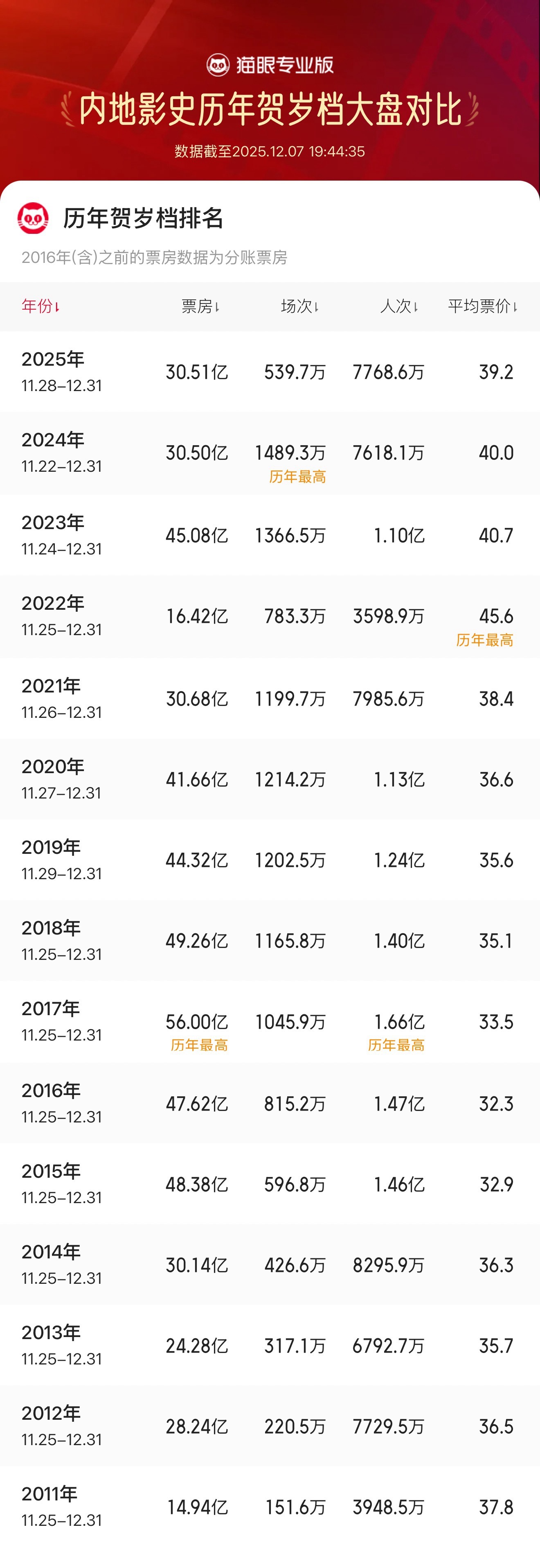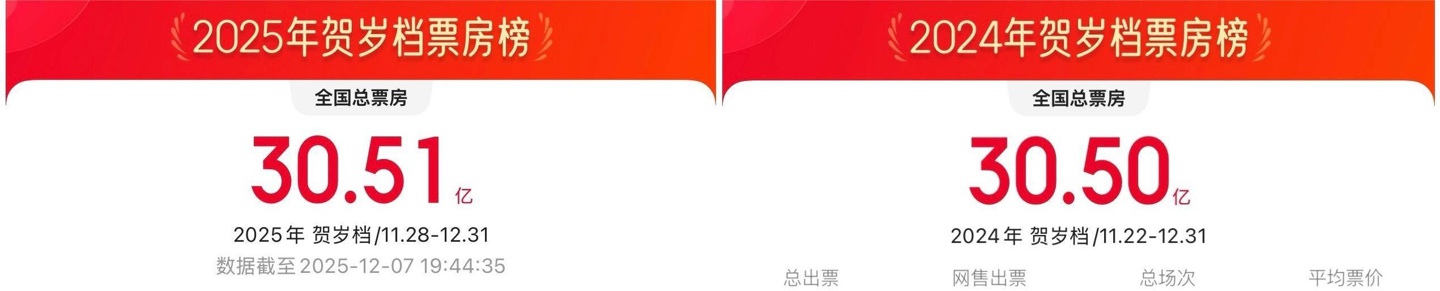 据灯塔专业版,截至 12 月 7 日 19 时 25 分,2025 年贺岁档(11 月 28 日-12 月 31 日)档期总票房(含预售)突破 30.51 亿元,已超越 2024 年贺岁档最终票房成绩!