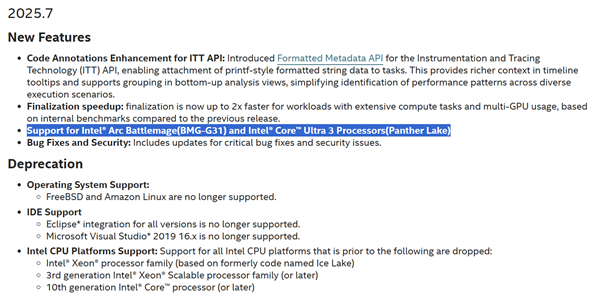 该GPU的名称出现在Intel的性能分析工具VTune Profiler更新日志中,更新日志明确指出,新版本增加了对两款核心硬件的支持: