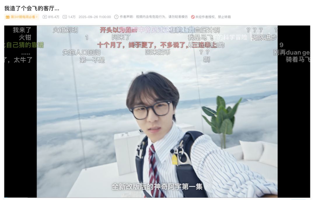 那个哥们叫阿宇,他做了很多疯狂的事儿,我们在两三年前就开始合作,那时候他在做喷气式相关的项目,影石挑战基金也和他合作过。没想到经过好几年打磨,他做出来的东西确实越来越厉害,甚至做到了‘空中客厅’。