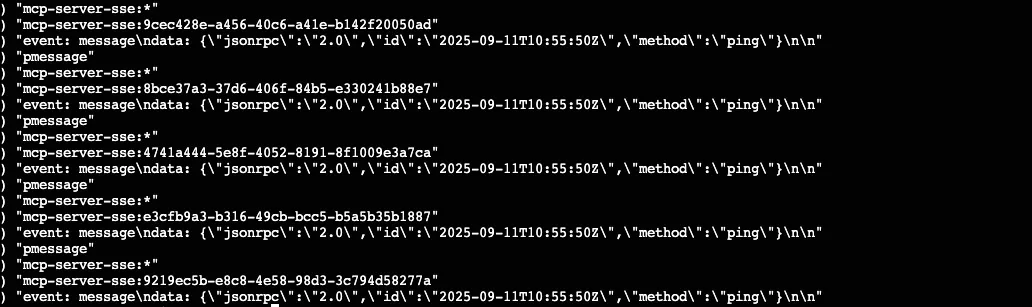 当整个 MCP 网关搭建完并使用的时候,在 redis 上通过 PSUBSCRIBE mcp-server-sse:* 命令可以看到如下的调用信息。