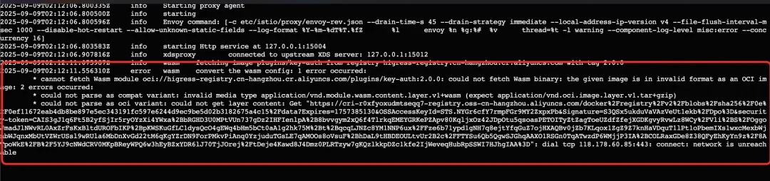 我们先尝试直接引用 docker 镜像进行部署时,会报 WASM 的插件错误,查看报错信息是通过 oci 地址去下载 WASM 插件的时候出现了问题。同时 Higress 实现 MCP 功能也依赖了 WASM 插件,这是一个绕不开的问题。