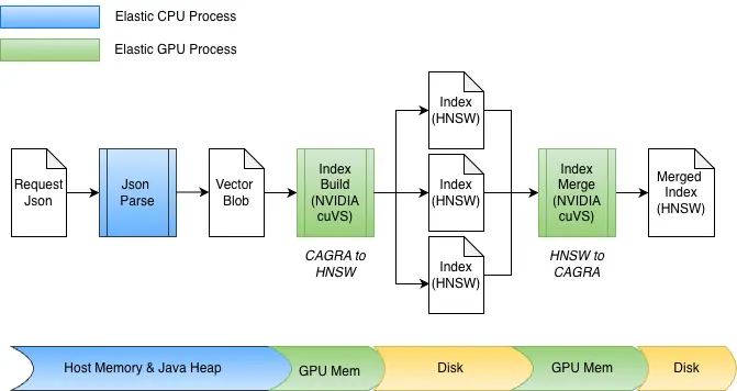 cuvs-java 库被集成到一个新的Elasticsearch 插件中;因此,GPU 上的向量索引可以在同一个 Elasticsearch 节点和进程中完成,而无需配置任何外部代码或硬件。在索引构建期间,如果安装了 cuVS 库并且存在并配置了 GPU,Elasticsearch 将使用 GPU 来加速向量索引过程。向量会被交给 GPU,由其构建CAGRA图。然后,这个图会被转换为 HNSW 格式,从而可以立即在 CPU 上用于向量搜索。构建后的图的最终格式与在 CPU 上构建的相同;这使得 Elasticsearch 在底层硬件支持的情况下能够利用 GPU 进行高吞吐量向量索引,同时释放 CPU 以处理其他任务(并发搜索、数据处理等)。
