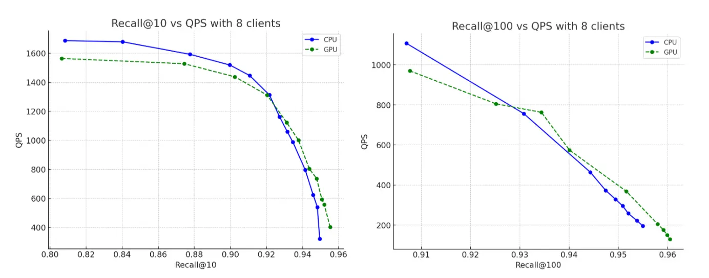 更强大的 CPU 实例确实表现出比上节基准更好的性能,这在预期之中。然而,当我们将这个更强大的 CPU 实例与最初的 GPU 加速结果进行比较时,GPU 仍然带来了显著的性能提升:索引吞吐量提高约 5 倍,强制合并提高约 6 倍,同时构建的图的召回率可达 95%。