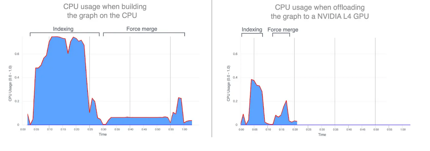 - CPU 使用率:将图构建任务卸载到 GPU 显著降低了平均和峰值 CPU 利用率。下图展示了索引和合并期间的 CPU 使用情况,突显了当这些操作在 GPU 上运行时 CPU 使用率大幅降低。在 GPU 索引期间较低的 CPU 利用率释放了 CPU 周期,可用于提升搜索性能。