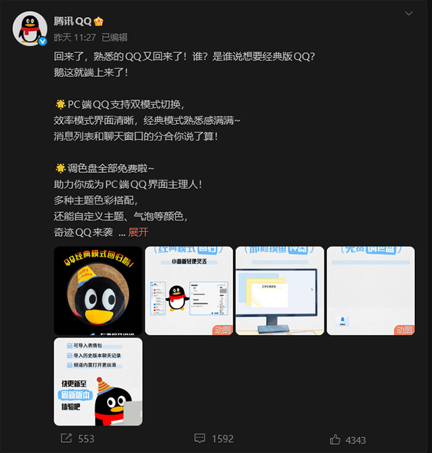 腾讯宣布经典版QQ正式回归。PC端QQ即日起支持“效率模式”与“经典模式”双轨并行,用户可自由切换。消息列表是否与聊天窗口合并、界面布局如何呈现,皆由用户自定。同时,调色盘功能全面免费开放,主题色彩、聊天气泡均可个性化设置。这一更新看似只是界面调整,实则是一次对数亿老用户情感的深度回应。