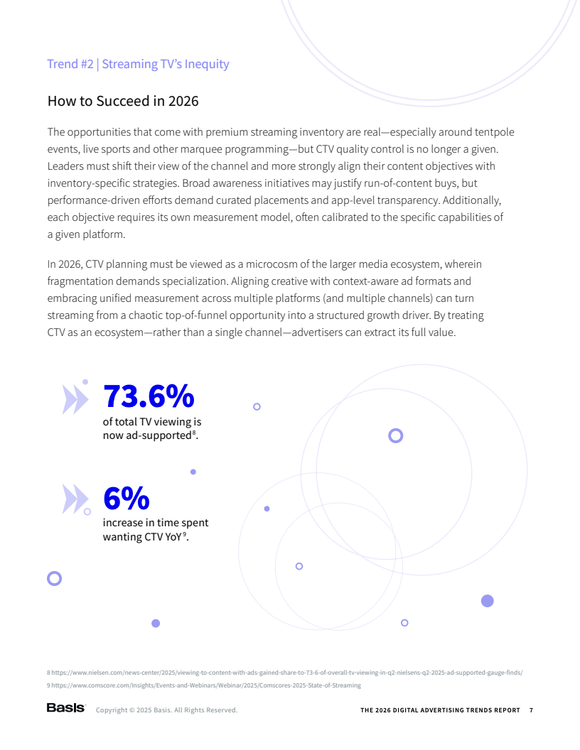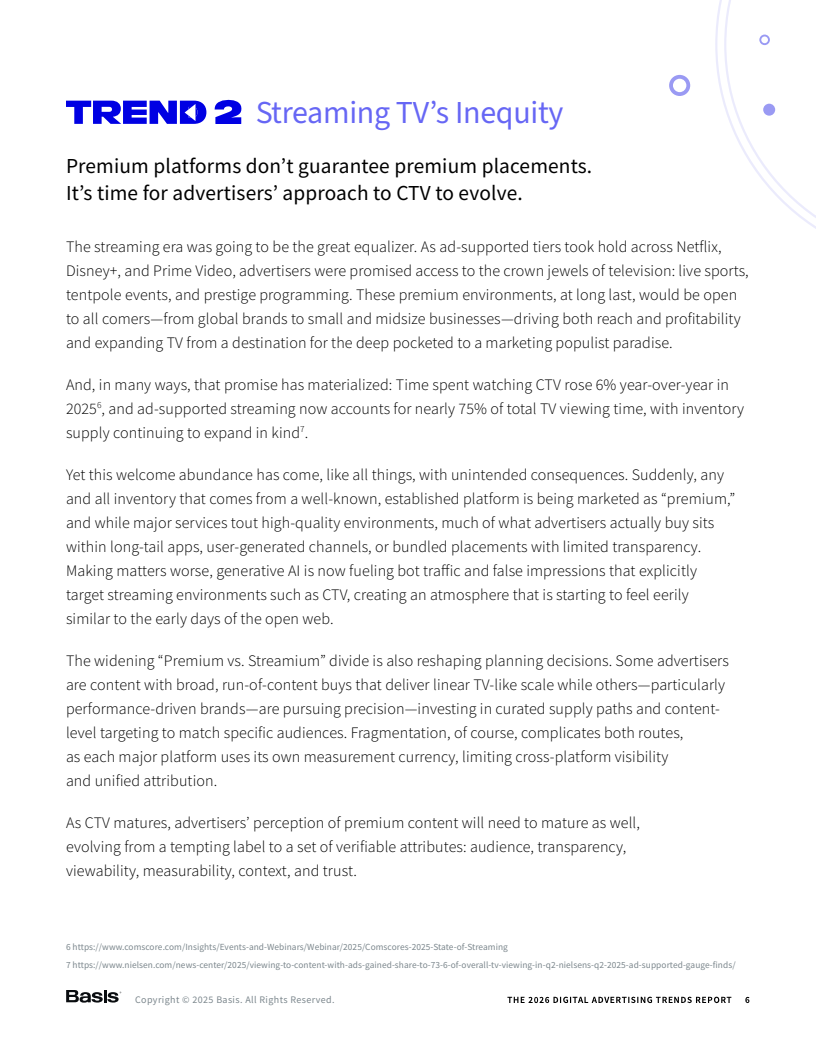 广告商曾希望通过流媒体平台实现更广泛的覆盖与效益,然而,随着平台内容的不断碎片化,广告主面临着质量与精准度的双重挑战。尽管Netflix、Disney+和Prime Video等平台的广告支持层级逐渐扩大,但许多广告位的透明度较差,且经常被低质量的应用和用户生成内容所填充。为了在2026年实现有效的广告投放,广告商必须精确地匹配内容和广告投放平台,追求更高的精准度和透明度,以适应不断变化的流媒体广告市场。