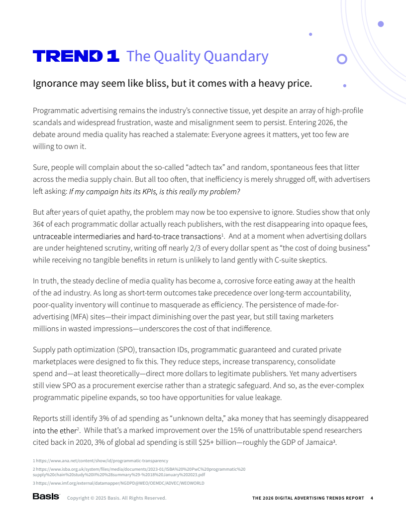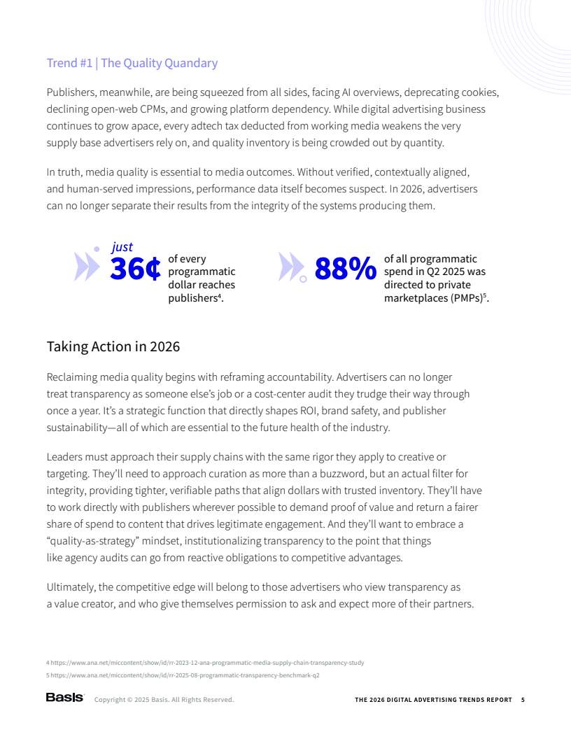 尽管程序化广告被视为连接广告主和出版商的重要桥梁,但仍存在大量隐性费用和不透明交易的现象。根据报告的数据显示,只有36%的广告预算真正流向出版商,其余部分被中介和隐藏费用消耗掉。这种浪费对于广告主和出版商的健康发展构成了严重威胁。为了实现长期的广告效果,广告主需要更加重视供应链的透明度,通过优化供应路径和实施更严格的质量控制,确保广告投入的每一分钱都能带来实际回报。