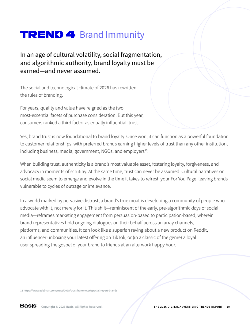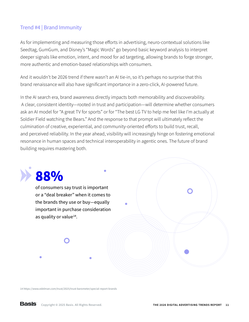 在今天的社会环境中,品牌的成功不再仅仅依赖于质量和价值,信任已经成为决定品牌忠诚度的关键因素。报告强调,品牌必须通过真实、透明的沟通来赢得消费者的信任,而这种信任将在未来的广告环境中成为品牌与消费者之间最重要的纽带。随着AI技术的发展,品牌的曝光和知名度不仅依赖于传统的营销手段,还必须在AI助手和搜索引擎的推荐机制中保持强大的竞争力。