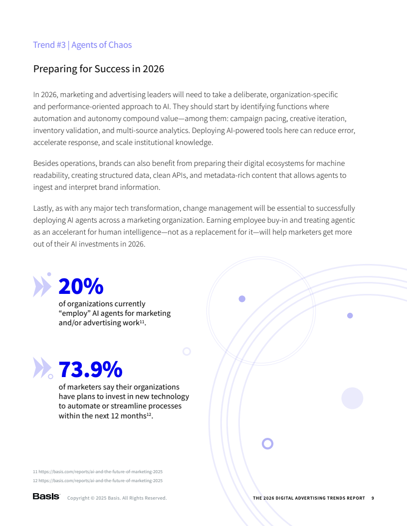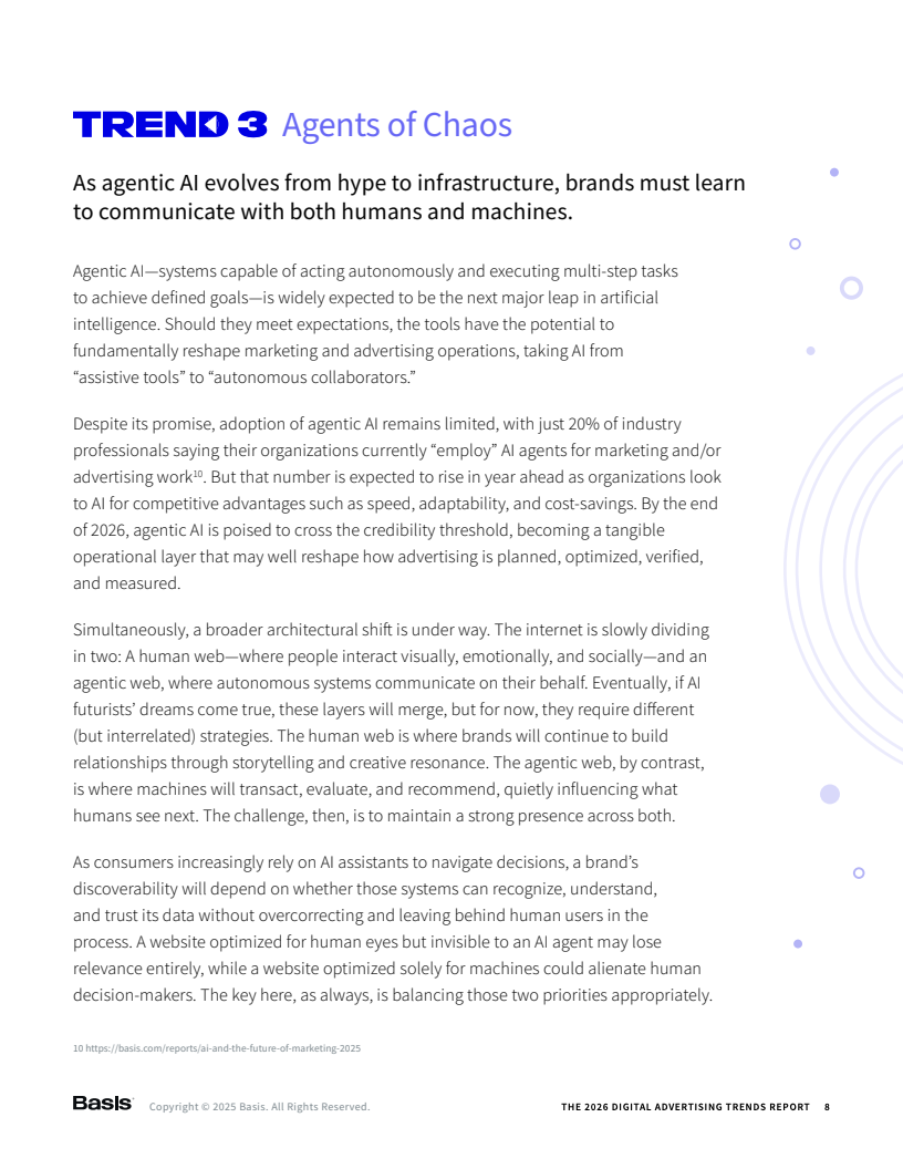 代理人工智能(Agentic AI)被视为下一波广告技术的革命力量。这种人工智能系统不仅能够自动执行复杂的广告任务,还能够基于用户行为预测并优化广告效果。报告预测,到了2026年,代理人工智能将成为广告运作的基础设施,帮助品牌提升效率并降低成本。然而,广告商需要平衡AI的自动化优势与人类创意的需求,确保广告内容能够在“人类网络”和“代理网络”中实现双向优化。