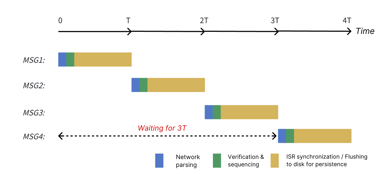 - 串行性(Serial): 服务端只有在完全处理完当前请求并发送响应后,才会开始处理下一个请求。这意味着,即便客户端并发发送了 N 个 ProduceRequest,服务端也会严格执行’One-by-One’策略:必须等到前一个请求的数据完成所有 ISR 副本同步并返回响应后,才会开始处理下一个请求。