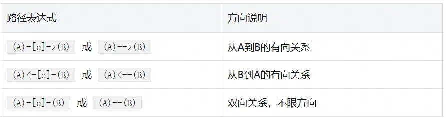 路径描述的语法遵循直观的方向性表达。(A)-[e]->(B) 表示从 A 到 B 的有向边,(A)<-[e]-(B) 表示从 B 到 A 的有向边,(A)-[e]-(B) 表示双向边(不限制方向)。用户可以为路径中的每个节点和边命名变量,这些变量可以在后续的 project 语句中使用。路径可以连接多个节点和边,形成多跳路径,比如 (start)-[e1]->(mid)-[e2]->(end)