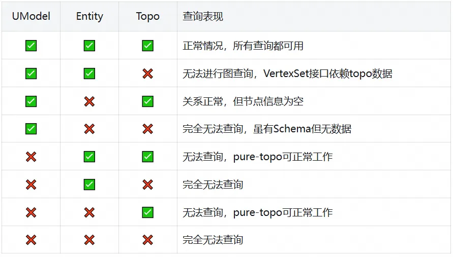 在使用图查询时,数据完整性是一个需要特别关注的问题。EntityStore 的图查询能力依赖于三方面的数据:UModel(数据模型定义)、Entity(实体数据)、Topo(拓扑关系数据)。这三方面的数据完整性直接影响了查询的能力和结果。