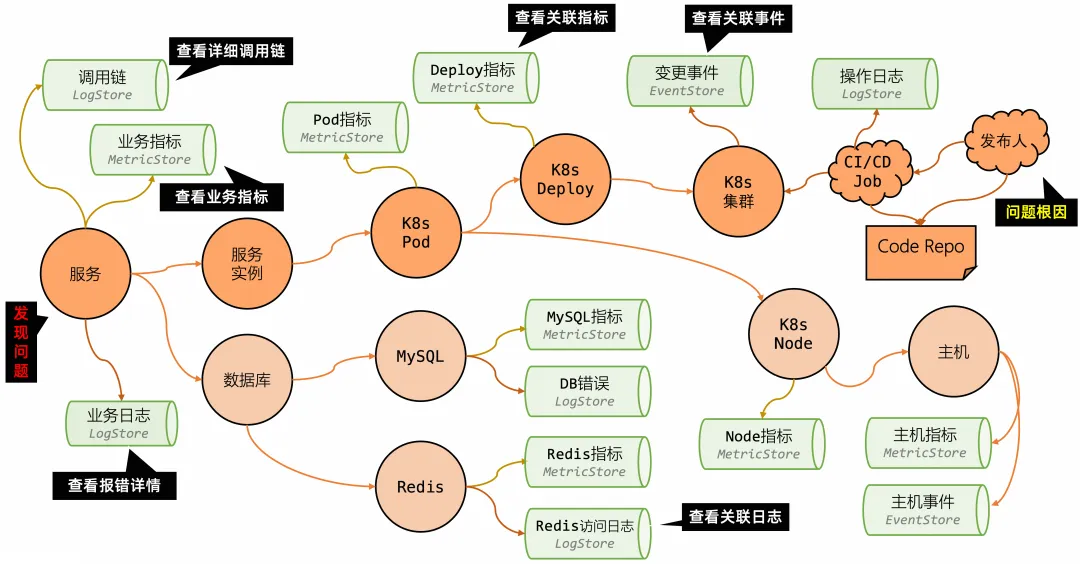 面对这一挑战,我们的解决思路是:将”图”(Graph)作为可观测数据模型的重要组成。我们认为,系统的真实形态本就是一张图,那么对它的查询和分析,也应该使用最符合其本质的方式——图查询。