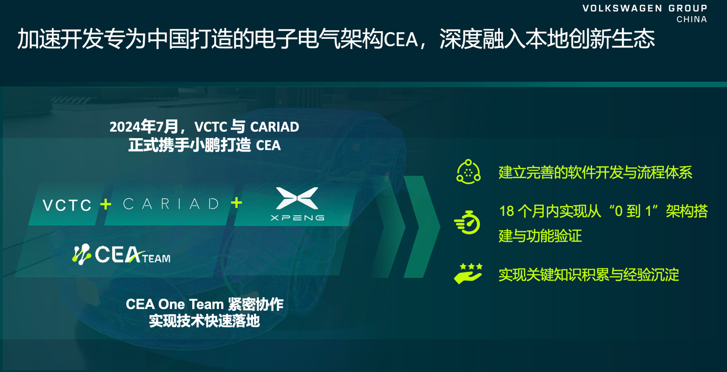 韩三楚介绍称,与小鹏汽车合作的搭载 CEA 架构的第一款车将于今年 12 月 31 日在大众安徽落地。“从架构设计到开发,到测试,和整车的集成,我们大大缩短了时间,只用了 18 个月的时间。”