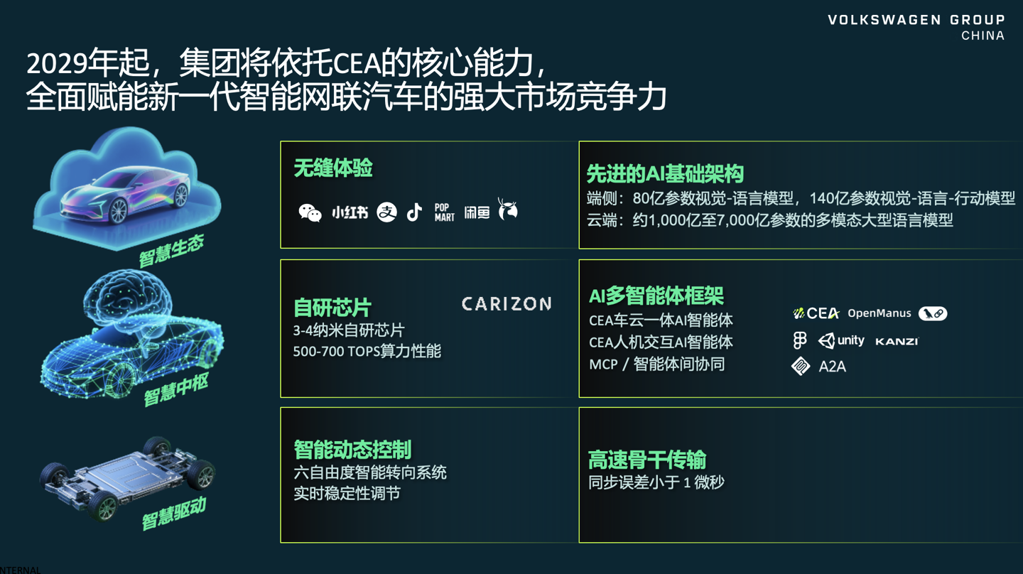 据介绍,CEA 架构 1.0 是快速补齐大众汽车集团在电子电气架构领域里的不足。今年年底提供第一辆车,从明年开始将有 4 辆车搭载 CEA 架构;从 CEA 架构 2.0 的开始,会做水平方向的拓展,不仅会支持 A 型车,同时会将整车 CEA 架构达到 D 型车。另外还有多动力的支持,CEA 2.0 将支持纯电、增程、混电,这是大众历史上第一次电子电气架构这么充分达到所有的车平台;另外,CEA 架构每两年迭代一次,2027 年出 CEA2.0,2029 年将是 CEA 的 3.0。