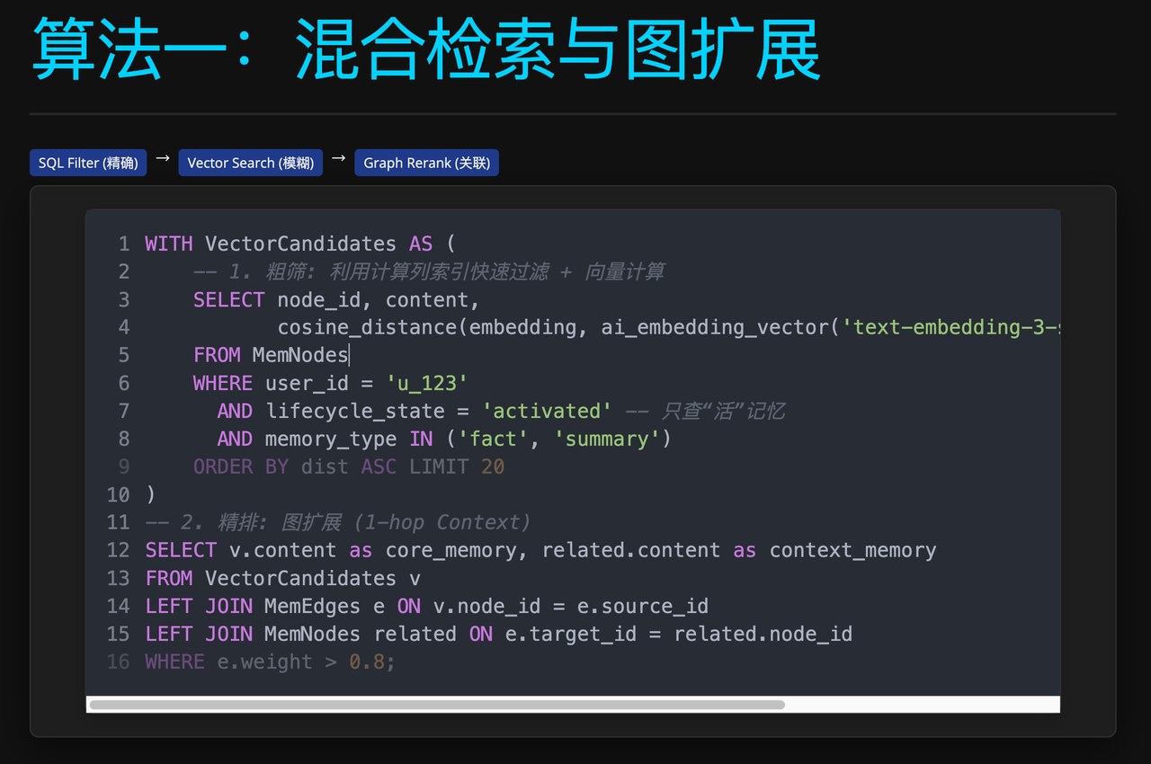 :user_query_embedding(包含”地点”、”吃”等语义)WITH HybridCandidates AS ( SELECT node_id, content, — 向量距离:衡量语义相似度 (越小越相似) cosine_distance(embedding, :user_query_embedding) AS semantic_dist FROM MemNodes WHERE user_id = ‘Bob’ AND lifecycle_state=”activated” — 全文检索:利用倒排索引强制匹配关键词,确保精确度 AND QUERY(‘content:”Sourdough”‘) ORDER BY semantic_dist ASC LIMIT 20 ) — 图谱扩展:拼接一跳关联 (如地点、评论) SELECT core.content AS core_memory, related.content AS context_memory, related.meta:topic AS context_topic FROM HybridCandidates core LEFT JOIN MemEdges e ON core.node_id = e.source_id LEFT JOIN MemNodes related ON e.target_id = related.node_id WHERE e.weight > 0.8;