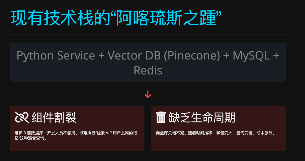 原有的技术栈采用了 “Python Service + Vector DB (Pinecone) + MySQL + Redis” 的组合。这种割裂的架构导致了维护成本高昂(需要维护 3 套数据库),且难以执行混合查询(例如”检索 VIP 用户上周的记忆”)。此外,缺乏生命周期管理导致向量库只增不减,随着时间推移,噪音变大,查询变慢,成本飙升。