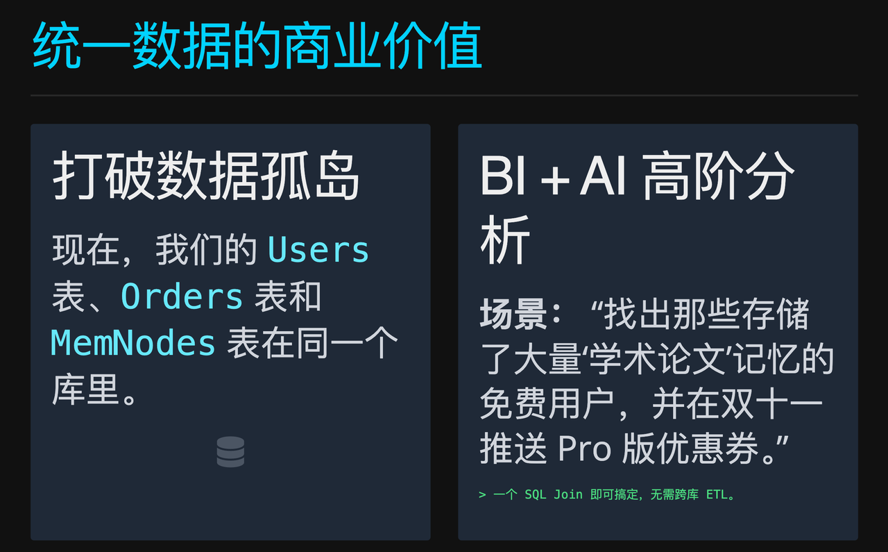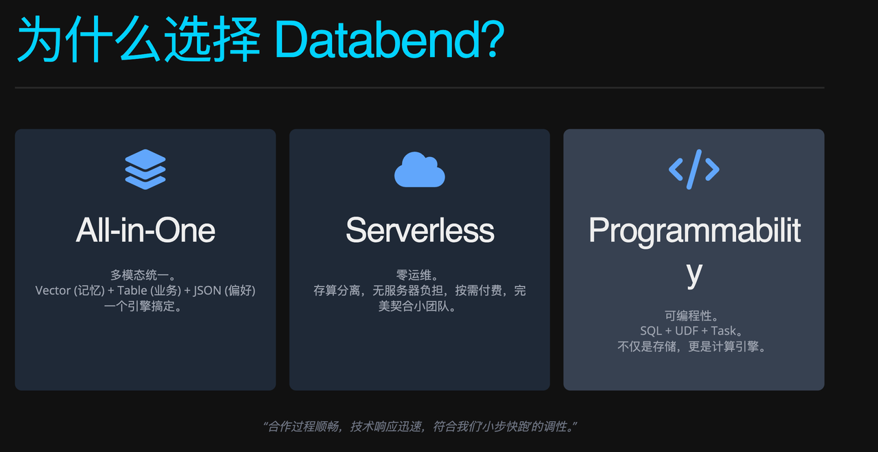 All-in-One (多模态统一) :Databend 支持 Vector(记忆)、Table(业务)和 JSON(偏好)在同一个引擎中处理,打破了数据孤岛。