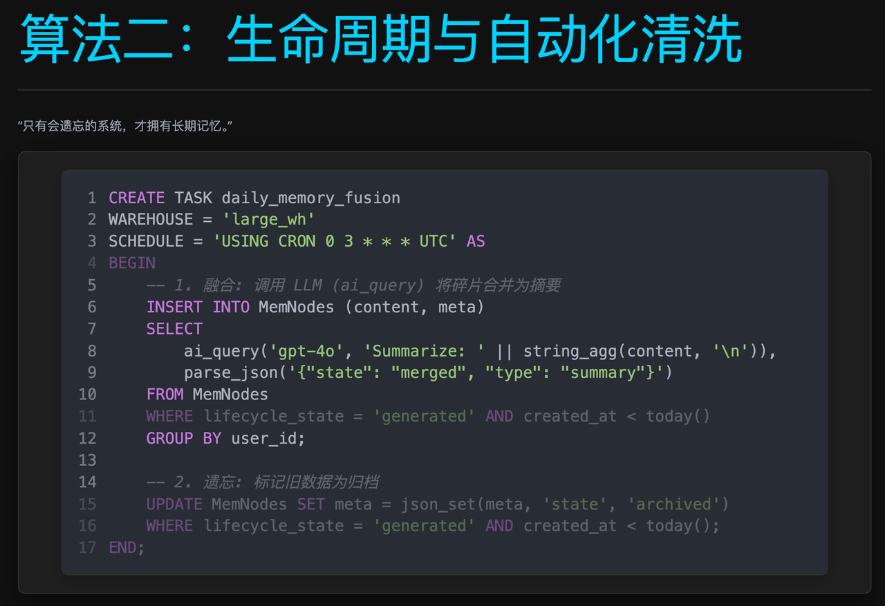 CLUSTER BY (user_id, lifecycle_state),强制让同一个用户的活跃记忆在物理存储上相邻。这意味着查询特定用户记忆时,数据库只需读取极少量的文件块,显著降低了 I/O 开销。 -