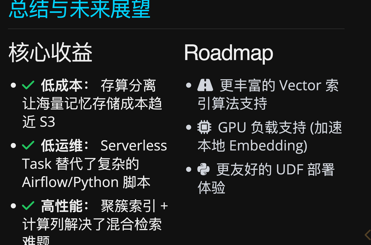Dynamic JSON (动态 JSON 加速) :记忆的元数据(Tags、Status、Time)往往是动态变化的。Databend 支持直接存储 JSON 数据并建立倒排索引加速查找,无需频繁变更表结构(Schema Evolution),即可实现毫秒级的多维过滤,这对于