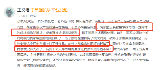 本月,多位消费者在黑猫投诉反馈,雷士照明灯具售后过程艰难。即便商家承认产品确实有质量问题,其解决方案也仅限于退换货,甚至让用户购买一个新产品再将原产品退货;而将因产品质量引发的全部衍生成本——如灯具拆卸的风险与费用、换货期间家中无光源的生活困境,以及首次安装对墙体线路造成的破坏等问题均转嫁给消费者承担。商家拒绝为其劣质产品所导致的“全链条后果”负责。