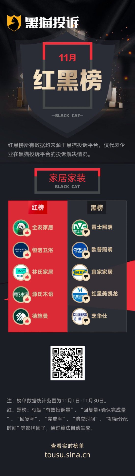 <p> 黑猫投诉 <a href="https://tousu.sina.com.cn/" target="_blank">【下载黑猫投诉客户端】</a>发布11月企业投诉处理红黑榜单,数据均来源于黑猫投诉平台,反映了企业在黑猫投诉平台的投诉处理解决情况。</p>