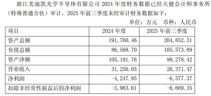 光学半导体公司成立于 2018 年 10 月,注册资本 10.08888889 亿元,法定代表人葛文志,经营范围涵盖光电子器件制造、集成电路芯片及产品制造、5G 通信技术服务等,同时具备货物及技术进出口资质。目前美迪凯持有其 90% 股权,服务贸易创新发展引导基金(有限合伙)持有 10% 股权。财务数据显示,该公司 2024 年资产总额 19.176046 亿元,营业收入 3.125005 亿元,净利润 – 4247.95 万元;2025 年前三季度资产总额 20.485231 亿元,营业收入 2.637147 亿元,净利润 – 6577.37 万元(2024 年度数据经审计,2025 年前三季度数据未经审计)。