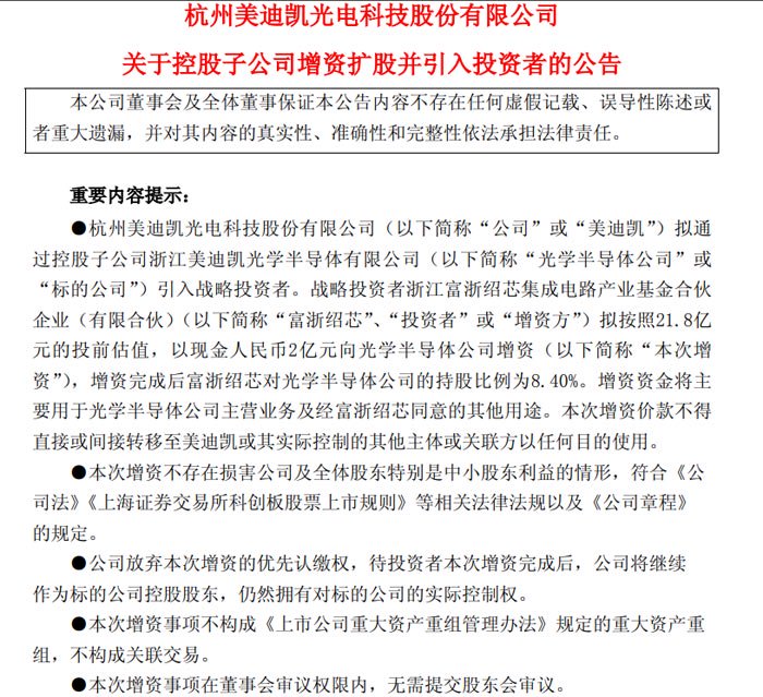12 月 10 日晚间,杭州美迪凯光电科技股份有限公司(证券代码:688079,简称 “美迪凯”)发布公告,其控股子公司浙江美迪凯光学半导体有限公司(简称 “光学半导体公司”)拟通过增资扩股方式引入战略投资者浙江富浙绍芯集成电路产业基金合伙企业(有限合伙)(简称 “富浙绍芯”),本次增资规模达 2 亿元人民币。